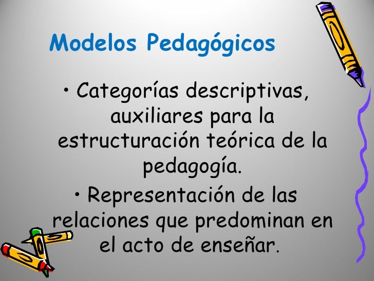 6. Modelos Pedagógicos • Categorías descriptivas, auxiliares para la estructuración teórica de la pedagogía. • Representación de lasrelaciones que predominan en el acto de enseñar.